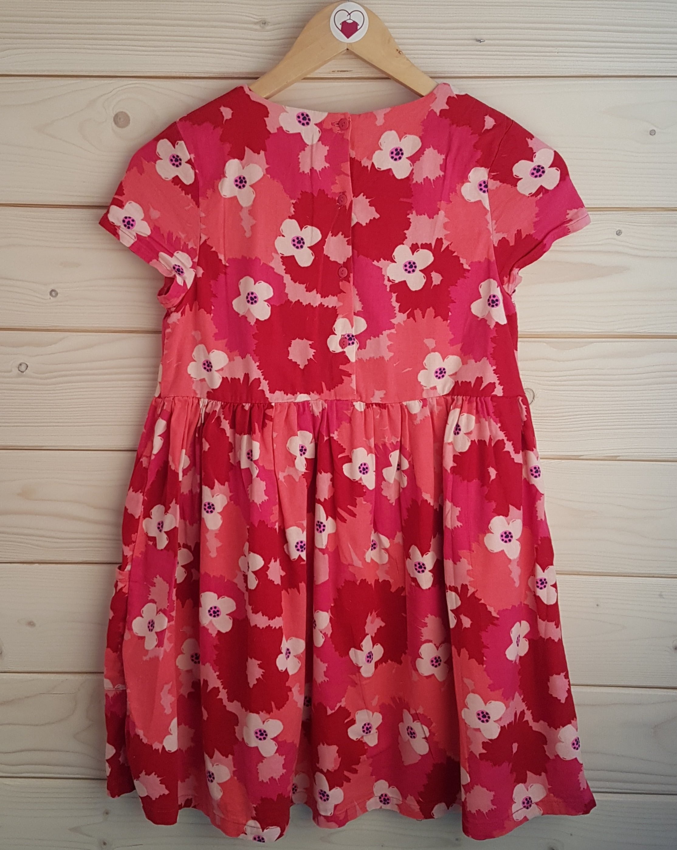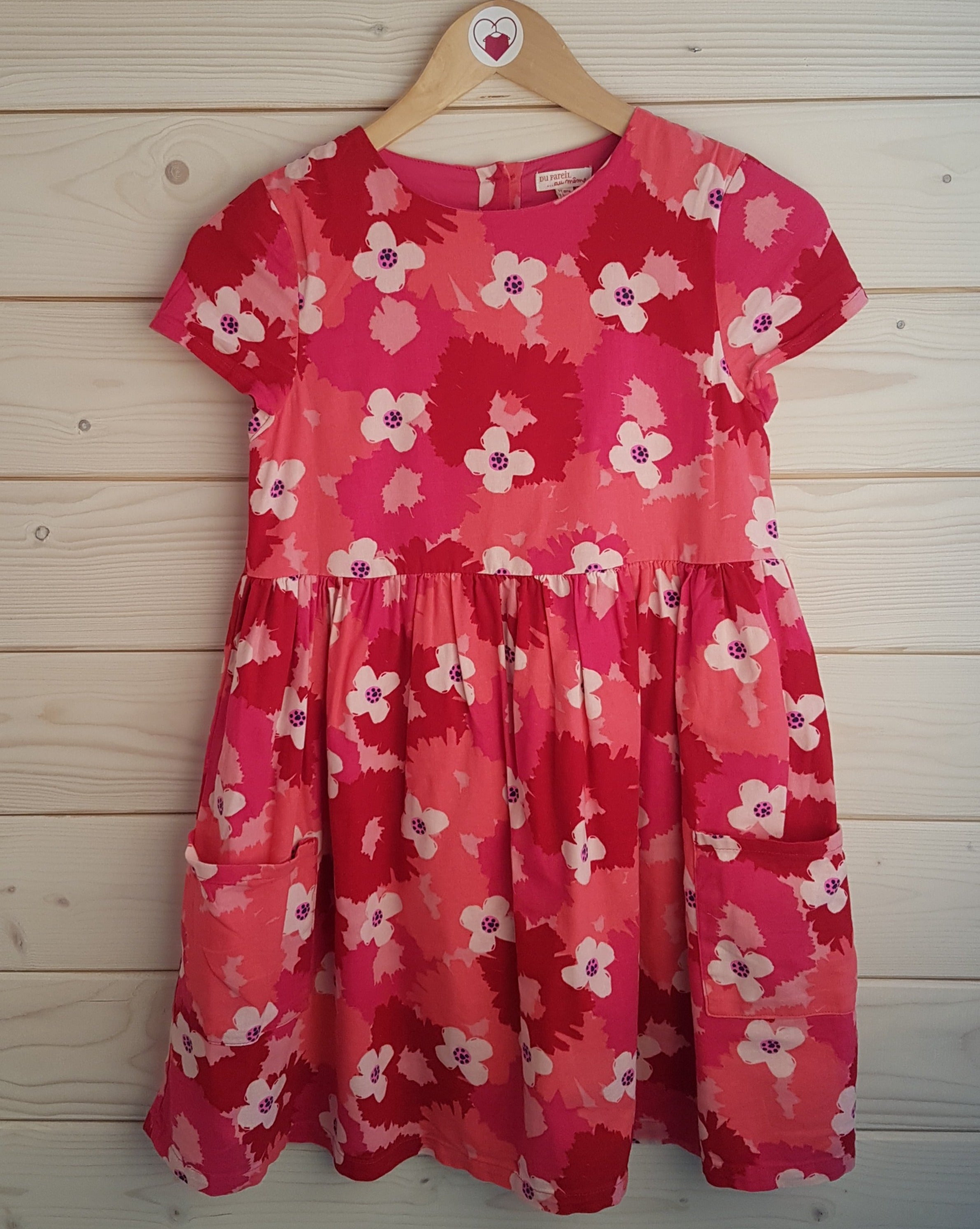 - Description: Pink short-sleeved dress with red & white floral pattern and pockets!