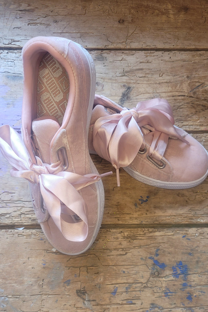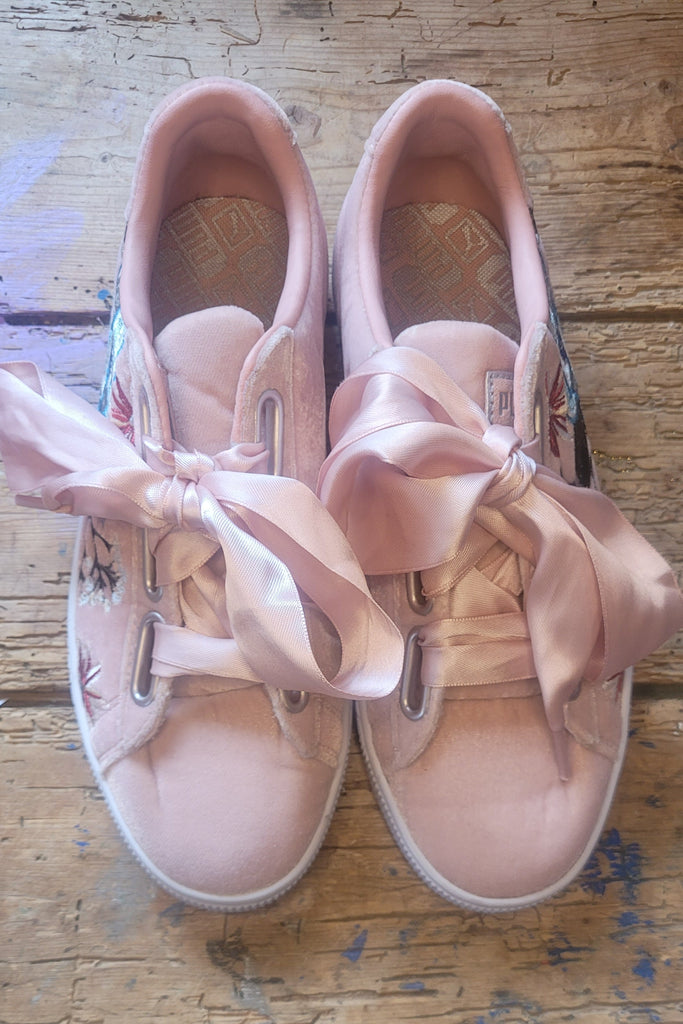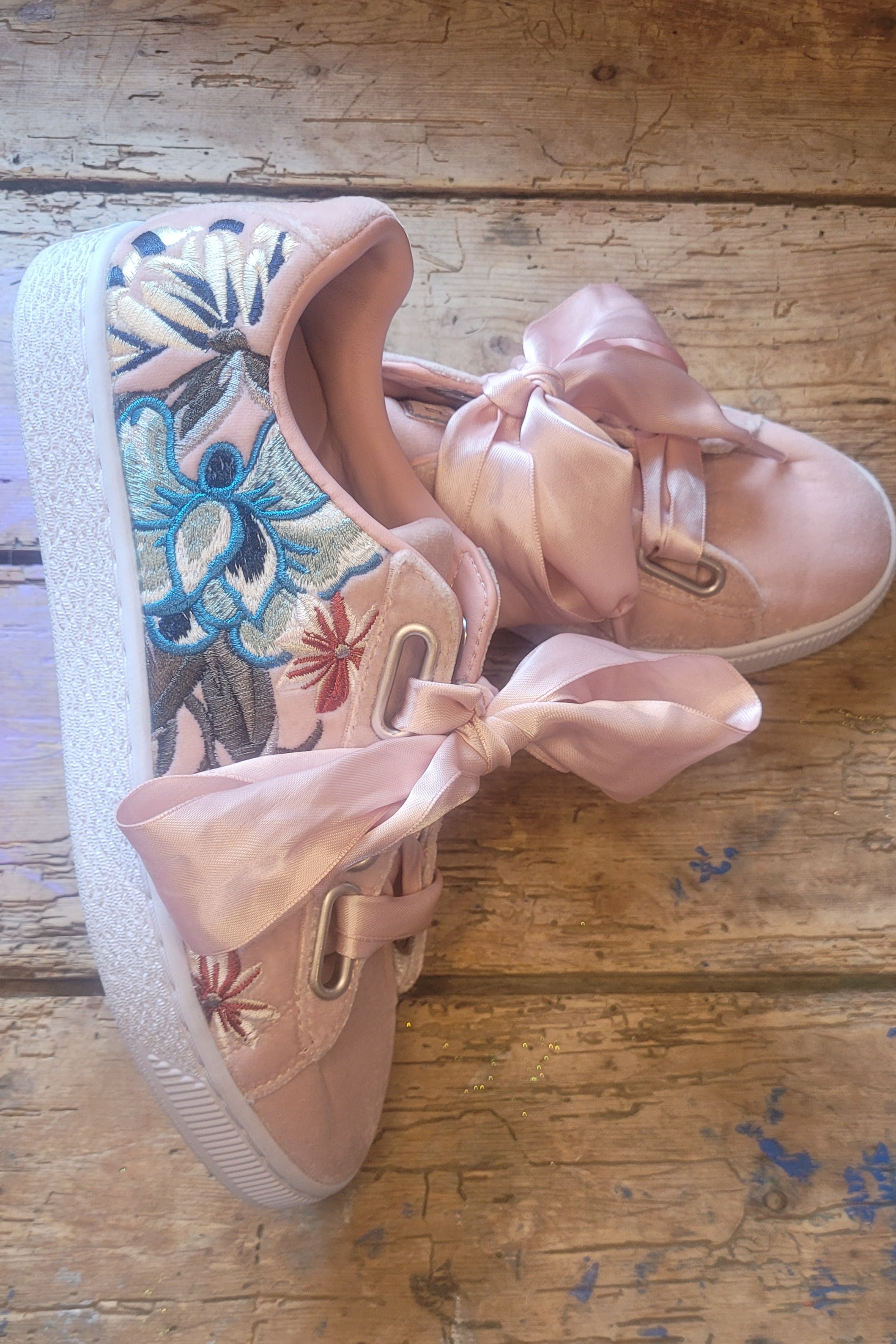 - Description: Puma Basket Heart Hyper Pink Embroidered Lace - The delicate embroidered lace detailing adds a touch of elegance, while the oversized satin ribbon laces bring a playful, feminine twist. Whether you're dressing up or keeping it casual, these sneakers are the perfect blend of sporty and sweet.
