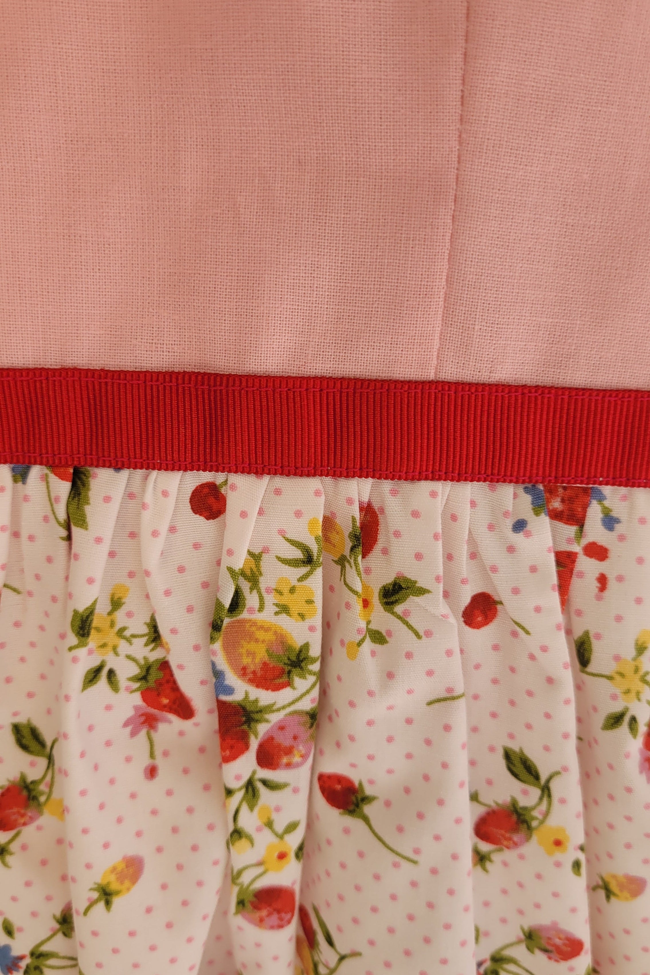 Soft Pink/Strawberry Patterned fabric/White & and ribbon tie.